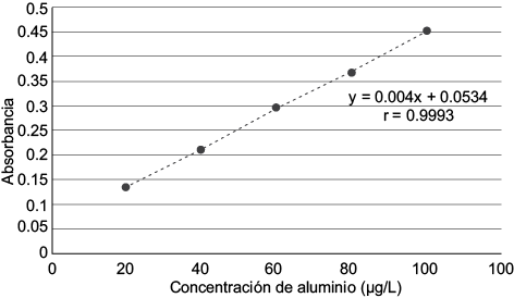Linealidad. Se comprobó a través de curvas de calibración y estimación del coeficiente de correlación (r) y de la pendiente (m). Para ello, se prepararon tres curvas de calibración a partir de un estándar de Al de alta pureza (Accustandard) que contiene 1000 mg/L de Al.