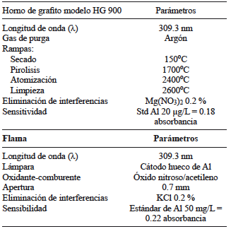 Se utilizó un equipo de EAA Perkin Elmer modelo AAnalyst 400, equipado con un horno de grafito Perkin Elmer modelo HG 900 con automuestreador AS 800. Se utilizó lámpara mono-elemento de aluminio, sistema de corrección de fondo y tubos de grafito integrados con plataforma Lvov (Perkin Elmer 2012).