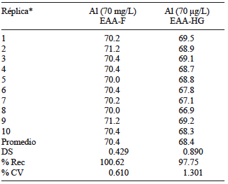 Los resultados obtenidos para exactitud y precisión son similares a los obtenidos por otros investigadores (Mishra et al. 2007) para Al en vacunas (% Rec de 93.26 a 103.41 y % CV de 1.62). Estos resultados son similares a los obtenidos durante la validación del método para cuantificar Cu y otros metales (entre ellos Al) en frutos del olivo (aceituna) mediante EAA-HG, con % Rec mayores de 95 y coeficientes de variación instrumental de 3 % (Soares et al. 2006).