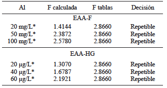 Para EAA-HG, se utilizaron estándares de trabajo a concentraciones por triplicado de 20, 40 y 60 µg/L de Al, que se acondicionaron con HNO3 al 2 % y Mg(NO3)2 al 0.2 %. El criterio de aceptación de la repetibilidad consiste en que Fcalculada ≤ Ftablas (Blair y Taylor 2007).