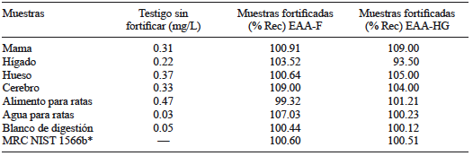 El método analítico validado se empleó para cuantificar la concentración de Al en tejidos de ratas sin fortificar y fortificados con 100 mg/L de Al para EAA-F y con 200 µg/L de Al para EAA-HG.