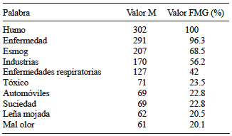Respecto al concepto estímulo “contaminación del aire”, se obtuvieron 160 palabras diferentes expresadas por los participantes, lo que refleja una amplia riqueza semántica y heterogeneidad del concepto. El cuadro I, muestra el conjunto SAM de este término, con las 10 palabras de mayor peso semántico (valor M) y la distancia semántica de éstas respecto al núcleo central (valor FMG). Del conjunto SAM, se obtiene como núcleo central la palabra “humo” (100 %), siendo ésta la palabra que se compartió con mayor frecuencia entre los participantes para definir la “contaminación del aire”. Como atributos esenciales sólo se aprecia la palabra “enfermedad” (96.3 %), la cual también es ampliamente compartida. Posteriormente, se encuentra “esmog” (68.5 %) como atributo secundario, mientras que como atributos periféricos se observan las palabras “industrias” (56.2 %) y “enfermedades respiratorias” (42 %). Las cinco palabras restantes se consideran atributos personales que detallan aspectos más específicos y menos compartidos respecto a la contaminación, como son “tóxico”, “automóviles”, “suciedad”, “leña mojada” y “mal olor”, las cuales reflejan algunas consecuencias de la contaminación, así como posibles causas de la misma.