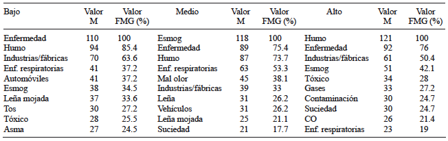 Para el nivel socioeconómico alto, “humo” (100 %) representa el núcleo central del concepto estímulo “contaminación del aire”. Como atributo secundario, se observa la palabra “enfermedad” (76 %) y como atributos periféricos las palabras “industrias” (50.4 %) y “esmog” (42.1 %). Por último, las seis palabras restantes representan atributos personales como son “tóxico”, “gases”, “contaminación”, “suciedad”, “monóxido de carbono” (CO) y “enfermedades respiratorias”. En este grupo tampoco se presentan atributos esenciales.