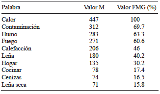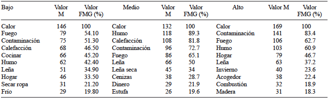 En el caso del nivel socioeconómico alto, al igual que en los dos grupos anteriores, “calor” (100 %) es el núcleo central para definir las estufas de leña. Como atributo esencial se aprecia la palabra “contaminación” (83.4 %). Le siguen “fuego” (62.7 %) y “humo” (60.9 %) como atributos secundarios y “hogar” (46.7 %) y “leña” (37.2 %) como atributos periféricos. Por último, se ubican las palabras “invierno”, “acogedor”, “combustión” y “madera” como atributos personales.