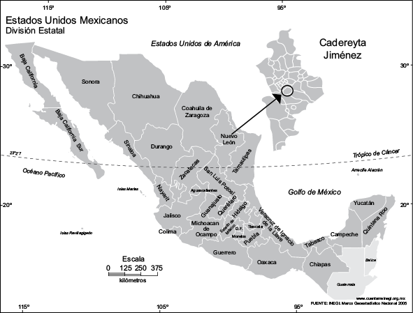 El municipio de Cadereyta Jiménez se encuentra ubicado a 336 msnm en la parte central del estado de Nuevo León, 25º 35′ 26″ N, 100º 0′ 5″ W. Es una zona urbanizada que cuenta con una población de alrededor de 86 mil habitantes. En el municipio se ubica la refinería de petróleo “Ing. Héctor R. Lara Sosa”, la cual representa una de las principales fuentes económicas para el municipio aparte de la agricultura y la ganadería de acuerdo con lo reportado por el Instituto Nacional para el Federalismo y el Desarrollo Municipal, (INFAED 2016; Fig.1).