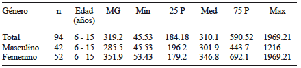 El cuadro I muestra la estadística descriptiva de los niveles urinarios de t,t-AM del total de niños incluidos en el estudio (n = 94) y agrupados por sexo. Se encontró un rango de 45.53 a 1969.21 µg/g CR con una mediana de 310.1 µg/g CR. No se encontraron diferencias estadísticas de los niveles urinarios de t,t-AM entre hombres y mujeres.