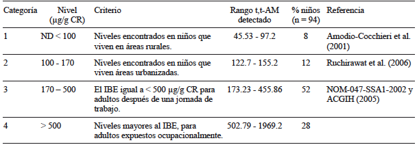 Los niveles urinarios de t,t-AM determinados en los niños incluidos en este estudio se categorizaron de la misma forma que lo reporta Pelallo-Martinez et al. (2014). El cuadro II describe cuatro categorías según el nivel de exposición a benceno en niños que viven en áreas rurales o en áreas urbanizadas, asimismo se toma el IBE como criterio de riesgo en adultos expuestos ocupacionalmente a benceno. Se observa que el 52 y 28 % de los niños entran en las categorías 3 y 4 respectivamente, con niveles de exposición entre 173.23 y 455.86 µg/g CR para la categoría 3 y 502.79 y 1969.2 µg/g CR para la categoría 4. Mientras que el resto de los niños, un 8 y 12 % entran en las categorías 1 y 2 respectivamente.