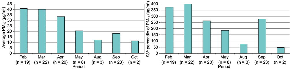 Figure 3 shows monthly averages of the personal PM10 1-h averages and the monthly 98th percentiles of the personal PM10 1-h averages that the pDRs recorded during the monitoring periods. The personal PM10 levels declined in time with a peak in September. This behavior follows the monthly averages of the historical time-series (2000-2009) of the Mexicali’s PM10 registered by fixed-site stations which was reported by the Instituto Nacional de Ecología y Cambio Climático (National Institute of Ecology and Climate Change, INECC) (INECC/SEMARNAT 2011).