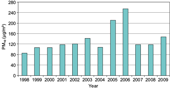 Figure 1 shows the historical annual averages of PM10 from Mexicali (1998-2009). Averages are permanently higher than those established by the Mexican air quality standards (SSA 2014), i.e., annual average (40 µg/m3) and 24-h average (75 µg/m3). PM10 data is shown up until 2009 because the fixed-site monitoring station network of Mexicali ceased operations in 2010; although two new fixed stations are currently being installed.