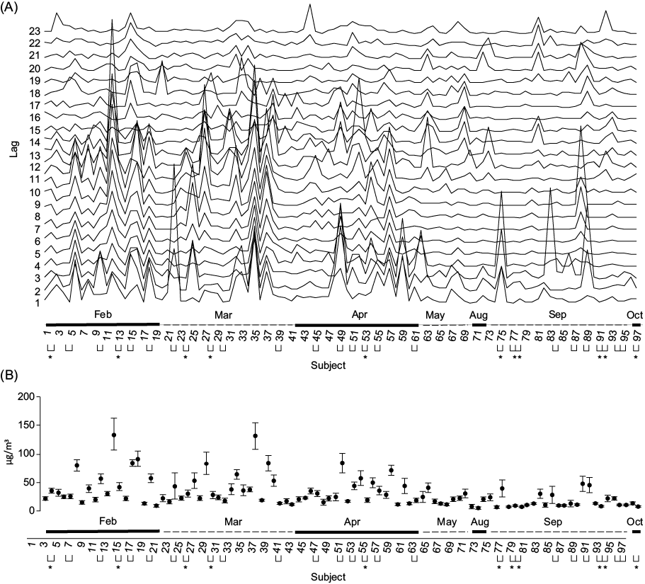 Figure 2a shows the time-series of the personal-PM10 1-h averages monitored by the pDRs, and figure 2b shows the individuals’ PM10 variability (average and 95 % confidence limits) during the same period. The vertical numbering on the left in figure 2a represents the lags (i.e., 2 to 24 h before the spirometry test) and the horizontal numbering represents the monitored subject (i.e., 1-97). On the horizontal axis, solid and dashed lines indicate the month in which the monitoring was carried out; for example, monitoring of subjects 1 to 19 took place during February, and figure 2b shows that PM10 average concentration and variability are higher between February and April and lower in May. Although three subjects (triplets) were monitored simultaneously per day, after the debugging of the database some samples were not included in the study ending with only three complete triplets; 29 lost one individual, and the rest lost two individuals. The symbol└┘ used in figure 2a under the individual’s number indicates those that were monitored on the same day; for example, subjects 1 and 2 were monitored on the same day in February and subjects 76, 77, and 78 were monitored on the same day in September. We used Spearman correlation to explore correlations between subjects monitored on the same day. In total, only 11 time-series showed autocorrelation (*p < 0.05).