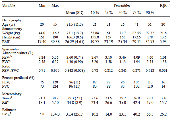 The average age in years was 33.8 ± 11.9 for men (n = 51) and 28.9 ± 10.5 for women (n = 46). The average weight was 80.3 ± 13.4 kg, with an average height of 171.9 ± 6.9 cm for men, and an average weight of 65.0 ± 14.0 kg, with an average height of 160.2 ± 5.3 cm for women. The overall average BMI was 25.3 ± 5.1 and 27.2 ± 4.1 for men and women, respectively. Overweight subjects (i.e., 25 ≤ BMI < 30) represented a 39.2 % of the study population, men (n = 11) had an average BMI of 27.5 ± 1.5 and women (n = 27) of 27.5 ± 1.7. Obese subjects (i.e., BMI ≥ 30) were 17.5 % of the study population with an average BMI for men (n = 9) of 33.4 ± 2.2 and 34.2 ± 2.6 for women (n = 8). Descriptive statistics of the studied variables are shown intable I. During the study period temperature was stable and relative humidity and PM10 did show important variations. Absolute and percent predicted averaged values of the spirometry tests were normal. No subject showed an FEV1/FVC ratio lower than 0.70, which means they had no pathological airflow obstruction.