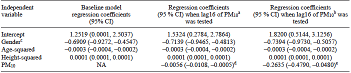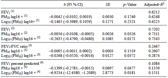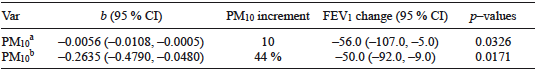Table IV shows the association of FEV1 with the most significant coefficient (i.e., lag16) of the untransformed and log10-transformed personal PM10. Models were evaluated for 10 µg/m3 of PM10 in air and 44 % increment in PM10, respectively. For the evaluation of the linear-log model, the 44 % increase was calculated by taking as the baseline the overall median concentration of personal PM10 (i.e., 23 µg/m3), then 44 % of that median level would represent around 10 µg/m3 of PM10 in air.