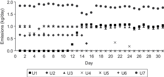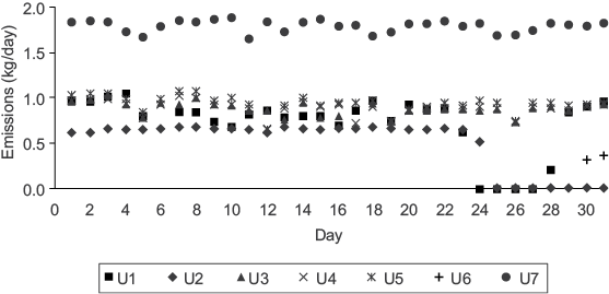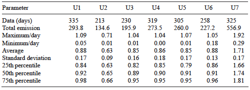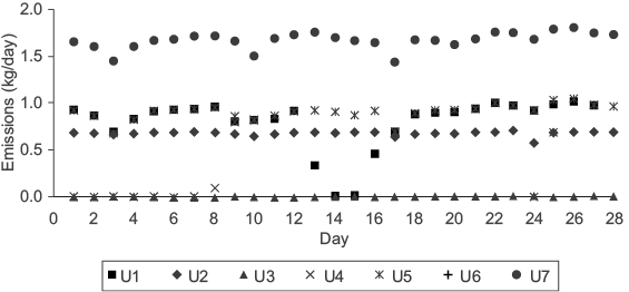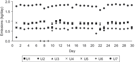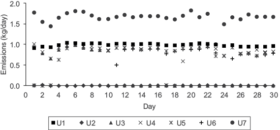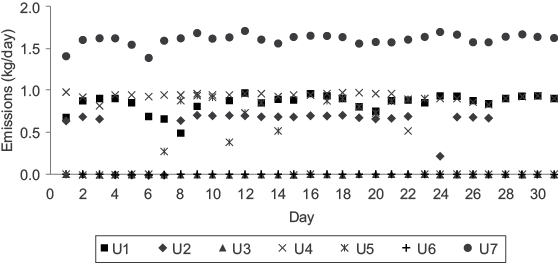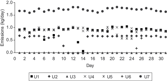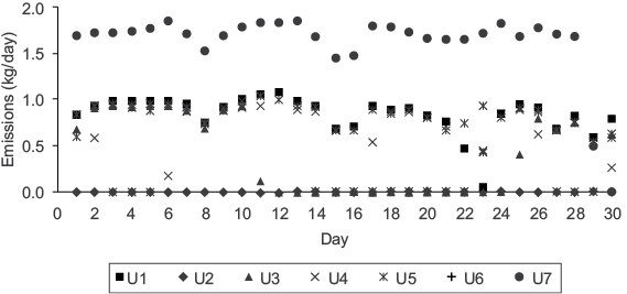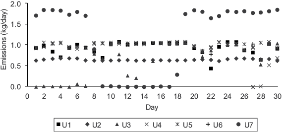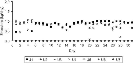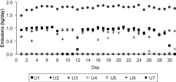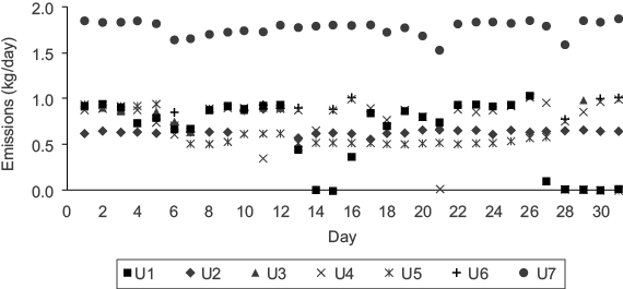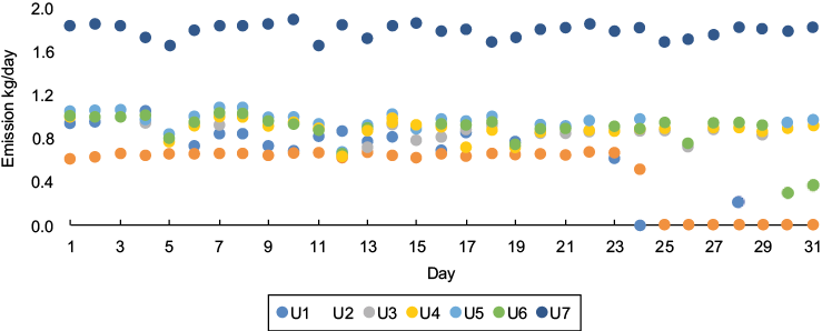 Figure 3 illustrates daily mercury emissions for each generating unit during May, as a case example. U7 emitted the highest amount of mercury, and all generating units were working during that month. Average mercury emitted into the atmosphere from U7 was 1.8 kg, due to its generating capacity of 700 MW; moreover, each generating unit from U1 to U6 have a generating capacity of 350 MW, and their average emission of mercury into the atmosphere was 0.9 kg. Similarly, some generating units were sometimes out of service for a few days or months because they were undergoing maintenance. A slightly higher amount of electricity was generated during April-July because most of the units were working and it was the period of greatest energy demand. Appendix 1 shows the daily mercury emissions for each month during 2013.