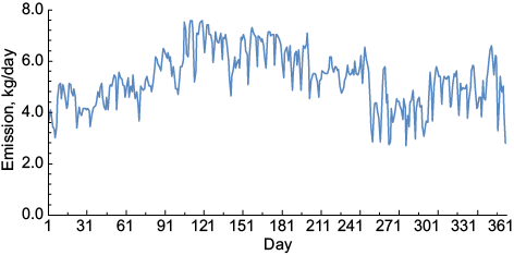 The temporal variability of mercury emissions per day is illustrated in figure 1. From April to July there was an increase in electricity generation, since in this time of the year (spring-summer) air conditioning systems operate at 100 % of their capacity. The highest mercury emissions (above 7.5 kg/day) from all units occurred in April 19, 24, and 25, with 7.53, 7.56, and 7.59 kg/day, respectively; May 2 and 3, with 7.52 and 7.57 kg/day, respectively. Total mercury emissions in 2013 were 1943 kg of mercury into the atmosphere from all units.