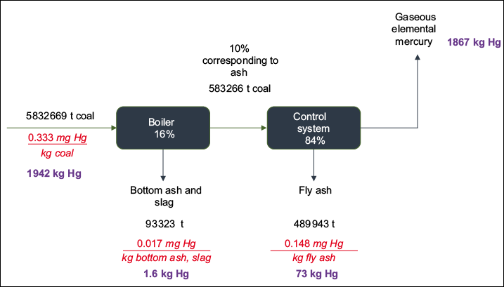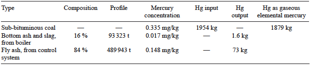 Also, it is very important to consider the mercury mass balance in the CETEPEC power plant, to determine how much is emitted to the atmosphere and how much was not combusted into the boiler and remains in the solid matter. The fractions corresponding to bottom ash, slag, and fly ash are 11, 5, and 84 %, respectively (USEPA 2002, 2011).