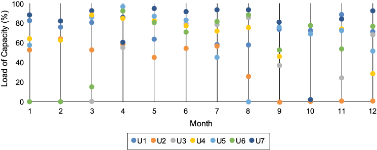 The efficiency of each electricity-generating unit during 2013 is shown in figure 4. The efficiency of U7 was consistently higher than 90 %, whereas U2 was less efficient. This figure also indicates periods during which some generating units were not working.