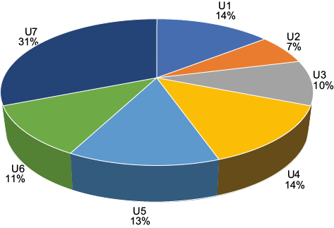 The percentage of total electricity generation supplied by unit in the CETEPEC plant during 2013 is presented in figure 5. U7 had the highest performance (31 %), whereas U2 had the lowest (7 %) because it was out of service for several months. The other units accounted between 10 and 14 % of the capacity. CETEPEC administration should consider the performance of U7 during the period of major demand for electricity generation.