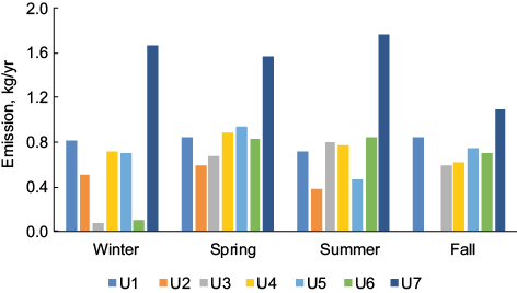 Figure 6 illustrates the amount of mercury emitted seasonally in 2013 by each generating unit of the CETEPEC plant. All units were working during the spring-summer season because of the high energy demand during this period. During autumn some generating units were working below their capacity, but mercury emissions from U7 were always above 90 % of efficiency for electricity generation.