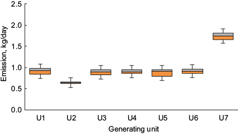 Figure 7 presents the variability of mercury emissions of each generating unit. U2 presented the lowest mercury emissions since it was out of service for several months. The variability of mercury emissions from U1 to U6 was similar and fell within the 50th percentile (0.93 kg/day). The 25th percentile was about 0.83 kg/day, and the 75th percentile was about of 0.95 kg/day. Regarding U7, the 50th, 25th, and 75th percentiles were 1.74, 1.7, and 1.81 kg/day, respectively. The standard deviation is low with respect to the average, indicating that the variability of mercury emissions by each generating unit is low.