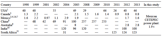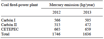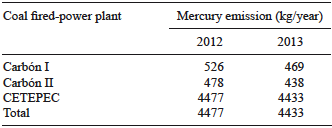 Table IIIshows estimated mercury emissions for the three coal-fired power plants located in Mexico according to Sosa et al. (2014). These estimates were calculated using the USEPA methodology, assuming a mercury concentration in coal of 0.113 mg/kg. Table IV shows mercury emissions estimated by Sosa et al. (2017) using the mercury emission rate.