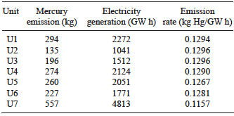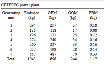 Table VI presents emissions of gaseous elemental mercury (GEM, Hg0), gaseous oxidized mercury (GOM, Hg2+), and particle bound mercury (PBM, Hgp) from the CETEPEC power plant in 2013. GEM is the major emission with respect to GOM and PBM, due to the control system installed in CETEPEC corresponding to the electrostatic precipitator. U7 presented the highest mercury emission as GEM, since it consumes about 6,000 t of coal per day due to its high capacity for electricity generation (about 700 MW).