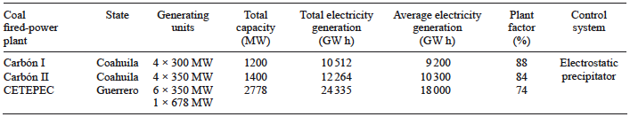 Three coal-fired power plants are installed in Mexico. Two operate in the north of the territory (Carbón I and Carbón II in the state of Coahuila), both using domestic (90 %) and imported coal (10 %), mainly come from the USA, Australia and South Africa. The third plant, referred as Presidente Plutarco Elías Calles (CETEPC), is located in the Pacific coast (in the state of Guerrero) and operates 100 % on imported coal, mainly from the USA.