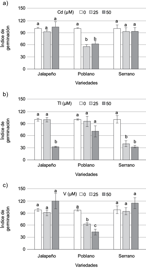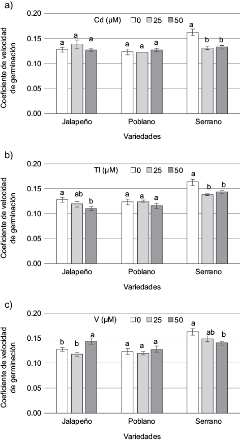 La velocidad de emergencia es de suma importancia, dado que define el tiempo de establecimiento en campo de las plántulas provenientes de semilleros o viveros (Sobrevilla-Solis et al. 2013). El CVG es un indicador que permite definir si la germinación de una semilla es lenta o rápida. El CVG varía de 0 a 1, valores que corresponden a la no germinación y a la rápida germinación, respectivamente (Sánchez et al. 2015). Asimismo, es importante considerar que el CVG es el recíproco del tiempo promedio de germinación (Ranal y García 2006), por tanto es independiente del porcentaje de germinación final (Kader 2005). En este sentido se concluye que en las semillas testigo (no expuestas a Cd, Tl ni V), el tiempo de germinación tiene el orden siguiente: serrano < jalapeño < poblano, lo cual indica que las semillas de la variedad poblano tardaron mayor tiempo en germinar que las semillas de las otras dos variedades. Asimismo, los resultados muestran que la velocidad de germinación de las semillas de jalapeño no fue afectada por los tratamientos con Cd: el Tl la retrasó y el V la incrementó. La velocidad de germinación de las semillas de poblano no fue influenciada por la aplicación de Cd, Tl o V. Por el contrario, la variedad serrano fue más sensible a los metales probados, al reducirse significativamente el CVG en presencia de éstos.