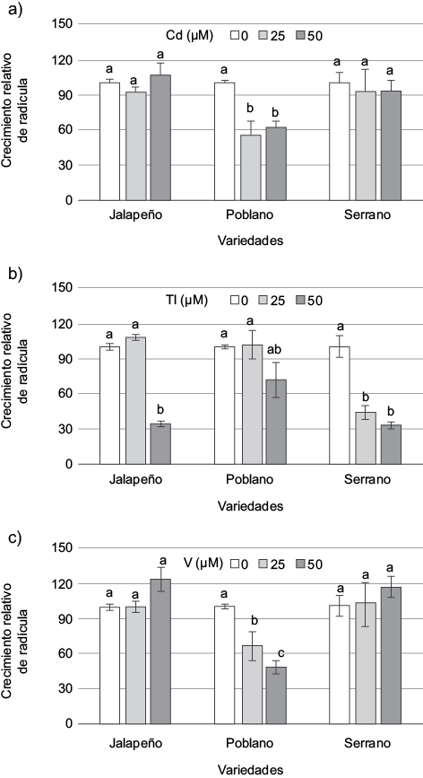 En semillas tratadas con V, solamente se observaron diferencias estadísticas significativas en el valor del CRR con la variedad poblano, registrándose decrementos del 33.3 y 52.3 % a las dosis de 25 y 50 µM, respectivamente; lo anterior indica que esta variedad es más susceptible a los efectos fitotóxicos del V (Fig. 3c).
