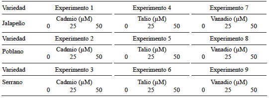 Se realizaron nueve ensayos independientes en los que se empleó un diseño experimental completamente al azar. Cada ensayo corresponde a uno de los metales evaluados a tres concentraciones por variedad (Cuadro I). Se utilizaron cloruro de cadmio (CdCl2, CAS 10108-64, Sigma Aldrich), acetato de talio (CH3COOTl, CAS 563-68-5, Sigma Aldrich), y metavanadato de amonio (NH4VO3, CAS 7803-55-6, Alfa Aesar) como fuentes de Cd, Tl y V, respectivamente.