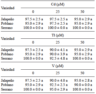 En plantas superiores, el Cd puede inhibir la germinación de semillas y el crecimiento de raíces, e inducir aberraciones cromosómicas y formación de micronúcleos (Aslam et al. 2014). Las semillas de chile jalapeño tratadas con Cd (25 y 50 µM) presentaron una media de porcentaje de germinación de 96.3 %, mientras que la del testigo fue de 97.5 % (Cuadro II).