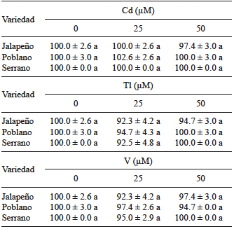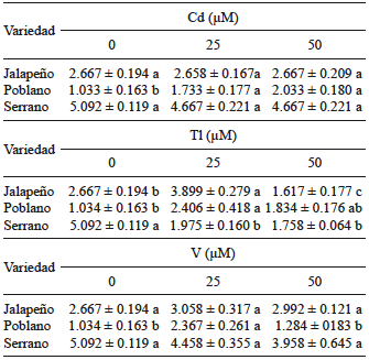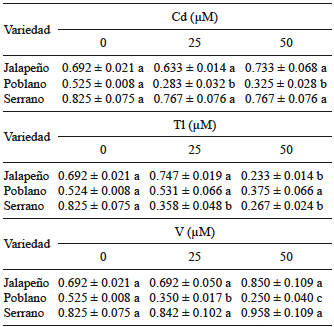 En nuestro estudio, el Cd resultó moderadamente fitotóxico en las concentraciones ensayadas en la variedad poblano. El Tl fue altamente fitotóxico en la variedad serrano. El V tuvo efectos diferenciales entre variedades: en jalapeño y serrano actuó como fitoestimulante; por el contrario, en la variedad poblano tuvo efectos moderadamente tóxicos cuando se suministró a 25 µM, y altamente tóxicos a 50 µM.