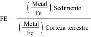 Para diferenciar la procedencia natural de las contribuciones antrópicas de metales y evaluar su impacto se calculó el factor de enriquecimiento (FE) respecto a la abundancia natural de los metales en la corteza terrestre (Turekian y Wedepohl 1961). Dicho factor reduce la variabilidad de los constituyentes asociada con las diversas relaciones granulométricas; es una herramienta conveniente para graficar tendencias geoquímicas a lo largo de áreas geográficas, e informa sobre la dinámica de un contaminante inorgánico o elemento químico de la corteza terrestre que puede ser acarreado por lluvia, viento o bien tener su origen en fuentes antrópicas (Kamau 2002, del Águila et al. 2005, Bitan et al. 2013). Para normalizar los datos se escogió Fe como elemento conservativo, ya que usualmente presenta altas concentraciones naturales, por lo que su distribución no está relacionada con otros metales pesados y difícilmente es enriquecido por fuentes antrópicas (Deely y Fergusson 1994). Su comportamiento geoquímico es similar a otros metales, tanto en ambientes óxicos como anóxicos, es muy abundante en la zona costera del estado Sucre y las fuentes naturales controlan 98 % de su presencia en el ambiente (Fuentes 1999).