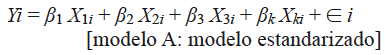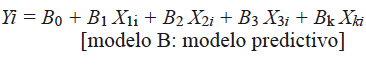 onde β0, β1,... βk – B0, B1, B2,…Bk son parámetros fijos desconocidos; X1i,...,Xki son variables independientes cuyos valores son fijados por el investigador, y ∈ i es una variable aleatoria inobservable (error aleatorio).