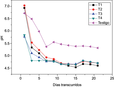 Al inicio del proceso los valores de pH de los tratamientos T3 y T4 fueron diferentes significativamente (p < 0.05) a los de los tratamientos T1, T2 y el testigo (5.77 ± 0.12 y 5.83 ± 0.06 vs 6.93 ± 0.06, 7.03 ± 0.06 y 6.72 ± 0.05, respectivamente).