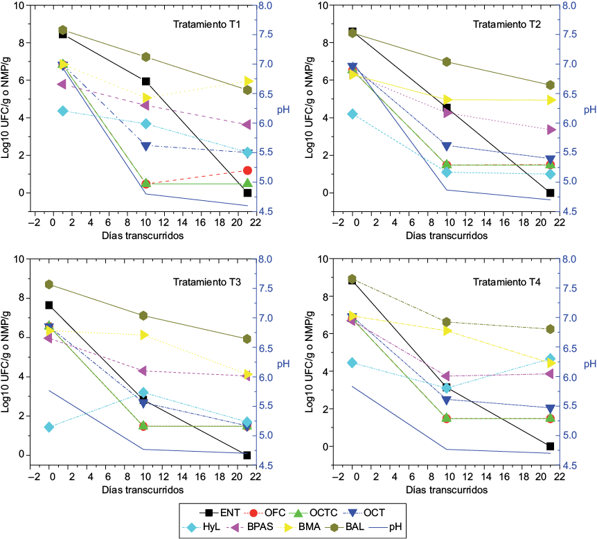 Al día 21 los contenidos de BMA, HyL, BPAS y BAL presentaron diferencias significativas con respecto al contenido registrado al inicio del proceso de ensilaje (p < 0.05), con disminuciones de entre 1 y 3 log10 UFC/g para todos los tratamientos. Por su parte, el tratamiento T2 fue el que presentó menor proporción de HyL y BPAS al día 21.
