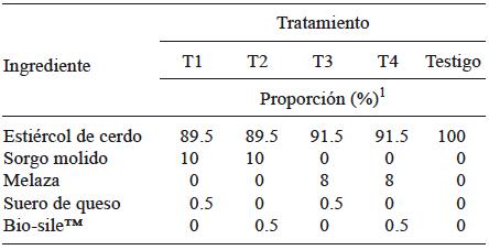 El ingrediente rico en carbohidratos correspondió a 10 % peso/peso (p/p) de sorgo para los tratamientos T1 y T2 y, 8 % p/p de melaza con 50 - 60 % de azucares (CONADESUCA 2016) para los tratamientos T3 y T4.