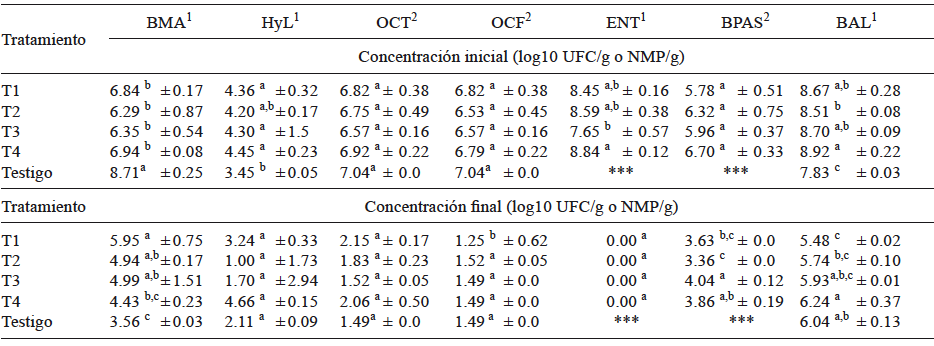 El indicador en menor proporción al inicio del experimento fue HyL (3.61 ± 0.46 log10 UFC/g). Sólo se registraron diferencias estadísticas entre tratamientos al inicio del proceso para los contenidos de ENT y BAL (p < 0.05).