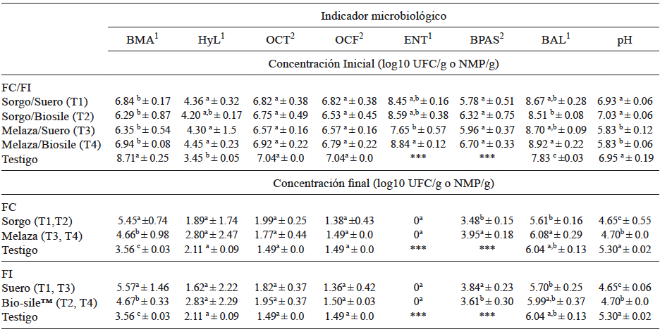 Las mayores reducciones de los grupos indicadores fueron observadas en los tratamientos con sorgo como FC respecto a los tratamientos con melaza; este resultado podría estar relacionado con el hecho de que el sorgo podría aumentar el contenido de materia seca en el ensilado y generar una mezcla más homogénea.