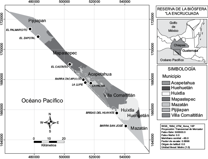 La Encrucijada (sitio RAMSAR núm. 815) se localiza al sur del estado de Chiapas, en la región fisiográfica denominada Planicie Costera del Pacífico, geográficamente ubicada entre los 14º 43’ y 15º 40’ latitud norte y 92º 26’ y 93º 20’ longitud oeste. Posee una superficie de 144 868 ha, de las cuales 36 216 ha pertenecen a dos zonas núcleo (La Encrucijada y Palmarcito) y 108 651 ha a la zona de amortiguamiento. La Encrucijada comprende parte de los municipios de Pijijiapan, Mapastepec, Acapetahua, Huixtla, Villa Comaltitlán y Mazatán (Fig. 1).