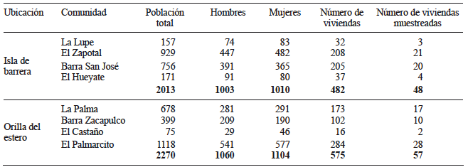 Se emplearon el muestreo probabilístico y el muestreo aleatorio estratificado (Cochran 2000). Para este estudio se identificaron dos estratos, islas de barrera y orilla del estero, los cuales se eligieron en función de los servicios naturales que brindan a las comunidades. Ambos estratos poseen comunidades con menos de 1000 habitantes; incluso, algunas que no rebasan los 200 habitantes están alejadas de la cabecera municipal y se accede a ellas por carretera y vía fluvial (CONAPO 2015). En cada estrato se priorizaron las comunidades a partir de la revisión de la literatura y con base en dos criterios. El primero corresponde a la ubicación y el segundo a la principal fuente de suministro de agua (INEGI 2010). Cada estrato quedó conformado por cuatro comunidades. El primero, denominado isla de barrera, quedó constituido por las comunidades La Lupe, Brisas del Hueyate, Barra San José y El Zapotal. El segundo, denominado orilla del estero, estuvo integrado por las comunidades El Castaño, El Palmarcito, Barra Zacapulco y La Palma.