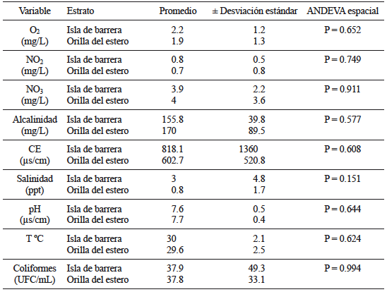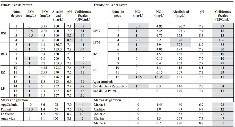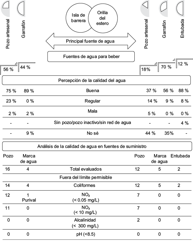 La mayoría de los entrevistados que poseen agua entubada la perciben de buena calidad en comparación con el agua de pozo (Fig. 2). El agua entubada se utiliza para regar plantas y patios de las casas, para consumo doméstico y para aseo personal. Los entrevistados asocian la calidad del agua de pozo principalmente con la filtración por la arena, la cercanía al estero, la distancia de su vivienda a la fosa séptica, la vegetación en su comunidad y la cercanía a la isla de barrera. Los análisis de calidad de agua mostraron que, de los 12 pozos evaluados, siete rebasan el máximo permisible para NO2 (> 0.05 mg/L) y para NO3 (> 10 mg/L). En cuanto a la alcalinidad, los pozos 4 y 5 rebasaron el máximo permitido (> 300 mg/L), en tanto que ninguno rebasó el pH de 8.5 que establece la norma. Los 12 pozos presentaron coliformes fecales, especialmente E. coli (Fig. 2 y Cuadro II).