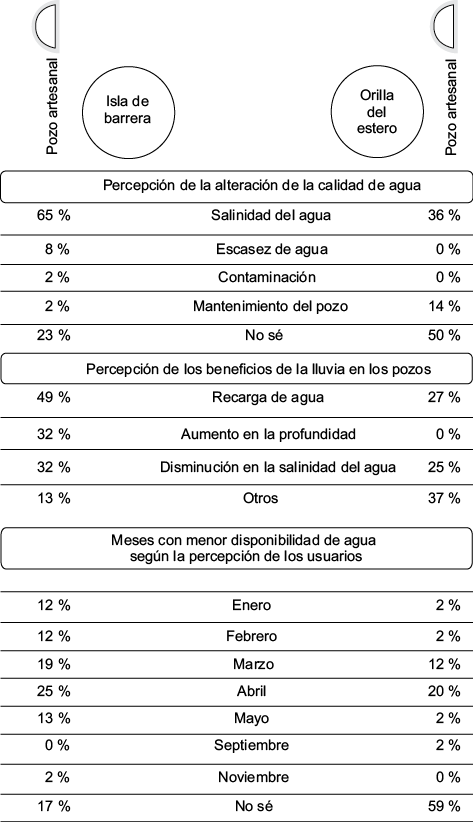Algunos usuarios asentados en orilla del estero no perciben alteración en la disponibilidad del agua en los pozos, otros señalan que la salinidad y el mantenimiento de los pozos, así como la escasez de agua, son factores importantes. Los meses del año que identifican con mayor escasez de agua son marzo y abril.