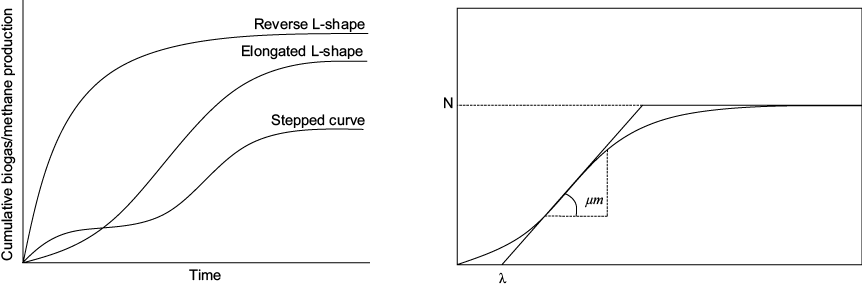 Figure 1 (right) shows the typical bacterial growth curve, which approaches a typical cumulative biogas and methane curve (Fig. 1 left). The bacterial growth begins with the dilatory gas generation and accelerates to a maximum growth rate µm in a certain time called lag phase λ. At this point the hydrolitic bacteria degrade polymers, carbohydrates, fat and protein, in monomers sugar, fatty acids and aminoacids. Afterwards a quick gas production can be apreciated, where methane is formed from the organic fatty acids, hydrogen and carbon dioxide. Latterly the stationary phase is reached, when the growth rate diminishes at the asymptote N (Ware and Power 2017).