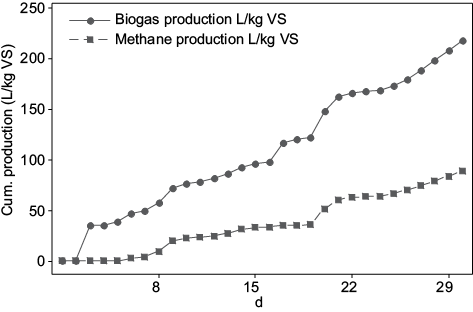 Figure 2 shows the cumulative biogas and methane production of vinasses over a period of time of 30 days. AD reached a biogas yield of 217 L/kgVSvinasses and a methane yield of 85.5 L/kgVSvinasses. In terms of removed COD the biogas and methane production resulted in 196 L/kgCOD removed with 55 % methane content in biogas, after 30 days of experiments. Méndez-Acosta et al. (2010) obtained 160 L/kg COD removed after 30 days start-up. Further operation of the bioreactor could result in an efficient AD, this can be confirmed with the curves of the predicted biogas and methane yields (Fig. 3), which were obtained by means of the modified Gompertz equation. According to the mathematically predicted values, after 120 days of experiments, biogas and methane yields should achieve approximately 325 L/kgVS and 125 LCH4/kgVS. By day 60, the curves should had achieved stable values around 300 L/kgVS and 120 LCH4/kgVS.