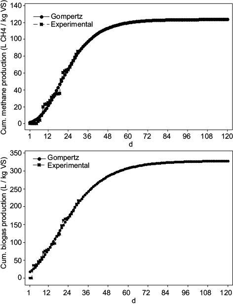 Main objective of the kinetic study was to determine the maximum production potential, maximum specific gas yield growth rate and lag phase. By means of the Gompertz equation the further behavior of the methane and biogas yield curves was predicted.