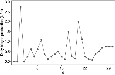 Some authors suggest that if all organic matter is anaerobically degradable and converted to methane, the expected methane production should be 350 L/kg COD removed by a long-term AD operation (Gallert et al. 1997, Koutrouli et al. 2009). Moletta (2005) reported a biogas production of 400-600 L/kg COD removed, in a long-term AD operation. Méndez-Acosta et al. (2010) reported a biogas production of 537 L/kg COD removed with 60 % methane, after 200 days of experiments. By day 30 (start-up) the biogas production was approximately 160 L/kg COD removed.