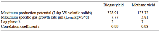 The biogas production began the second day of the start-up process and the methane production the fifth day. AD occurs in four steps: hydrolysis, acidogenesis, acetogenesis and methanogenesis. The different inoculum bacteria groups related to each biogas production stage, reproduce at different rates to degrade polymers and generate acetic acid, hydrogen and carbon dioxide for the methane production (Friehe et al. 2013). The reproduction rate of the methanogenic bacteria is the most slowly of all the bacteria groups. Methanosarcina needs up to 360 hours for reproduction and the methanococcus 240 hours. In comparison, the hydrolytic and acidogenic bacteria need 24 - 36 hours and the acetogenic bacteria 40 - 132 hours for reproduction (KWS 2009). For this reason, methanogenesis is the slowest step to methane production. This is reflected in the present work, where the methane production started five days after biogas generation started. The results of the kinetic study are shown in table IIIand figure 3. Both experimental curves showed good visual fits to the curves generated from the Gompertz equations. The correlation coefficient r shows also values near to 1, what indicates a positive correlation between experimental and theoretical curves. The maximum specific growth rates µm were 7.77 L/kgVS*d for biogas and 3.81 LCH4/kgVS*d for methane. As expected according to the slow reproduction rate of the methanogenic bacteria, the lag phase or time to achieve µm, was achieved in 2 days for biogas and 7 days for methane.