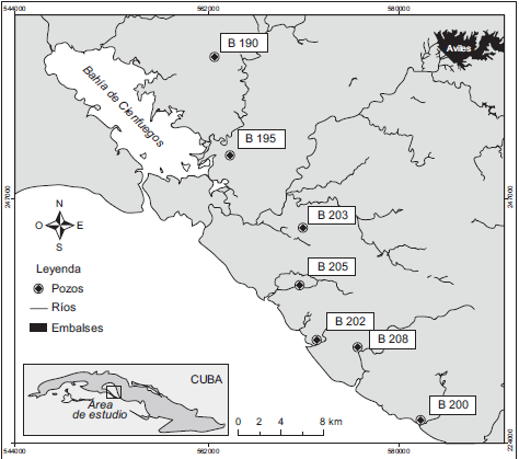 En el estudio se usaron los resultados de parámetros físicos y químicos de siete pozos ubicados al sureste de la provincia de Cienfuegos, en el tramo comprendido entre la desembocadura del río Yaguanabo hasta el este de la bahía de Cienfuegos (Fig. 1). Los datos físicos y químicos y la información relacionada con el uso y explotación de los pozos durante la etapa de comprendida entre los años 1985 al 2015 se obtuvo en la Delegación Provincial de Recursos Hidráulicos (DPRH). El muestreo fue periódico pero los datos almacenados son irregulares y como resultado el número de mediciones fue diferente en cada pozo.