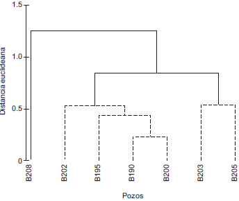 El análisis de agrupamiento jerárquico de los pozos en estudio permitió la obtención de tres grupos: primer grupo compuesto por el pozo B208, el segundo grupo: B190, B195, B200 y B202, y el tercer grupo: B203 y B205. En el dendrograma se muestra en líneas discontinuas la estructura del grupo para la que hay similitud entre los pozos (p > 0.05). Las líneas continuas representan las divisiones entre los pozos que fueron diferentes (p ≤ 0.05) (Fig. 2).