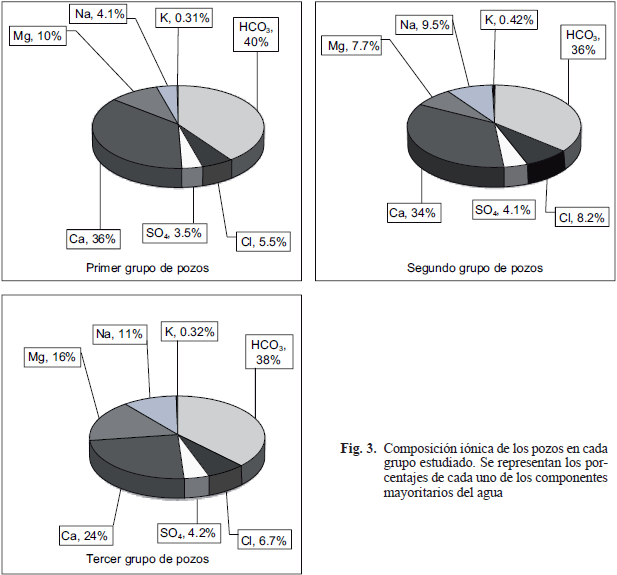 El agua se clasificó como bicarbonatada cálcica, sin embargo en la figura 3se observa que ocurrió un incremento significativo en las proporciones de Na. en el tercer y segundo grupo, con el valor más bajo para el primero (p ≤ 0.05). Una de las procedencias de estos iones son los aerosoles marinos (Jha et al. 2009). La cercanía de estos pozos a la zona costera pudo causar el incremento en las proporciones de Na., ya sea por aerosoles o por intrusión, combinado con el uso y manejo de estas fuentes de agua que también hacen aportes. Al realizar esta misma comparación, las proporciones de Ca2+ y HCO . fueron más altas en el primer grupo (p ≤ 0.05). Cuando la composición salina del agua está determinada por la meteorización de las rocas, se caracteriza por un predominio de estos iones (Pehlivan y Yilmaz 2005, Jha et al. 2009).